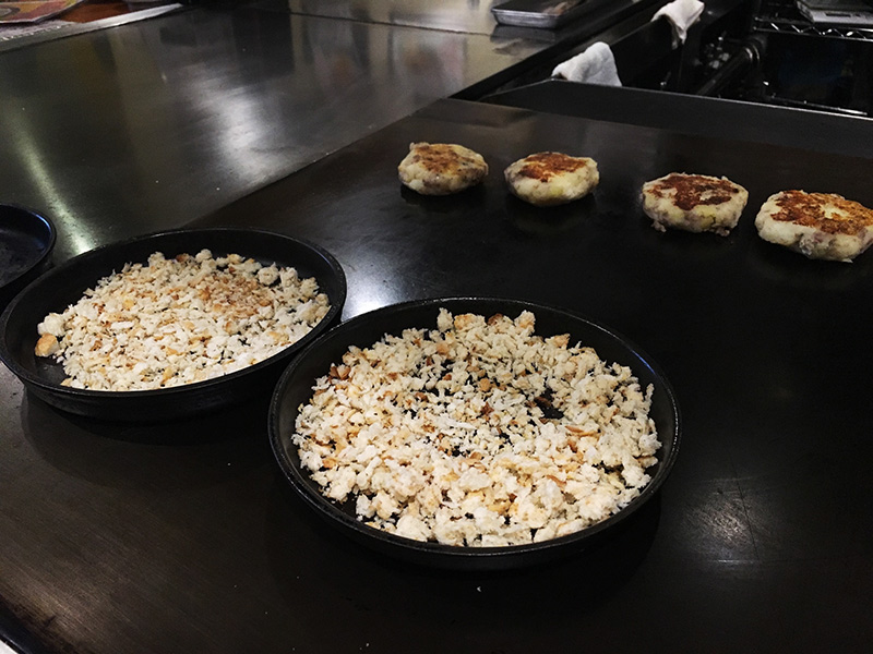 コロッケのひき肉は、鉄板焼きメニューでも使用している和牛を使用しているそうです。また、サクサク感を出すために生パン粉を炒っています。では、いただきます!