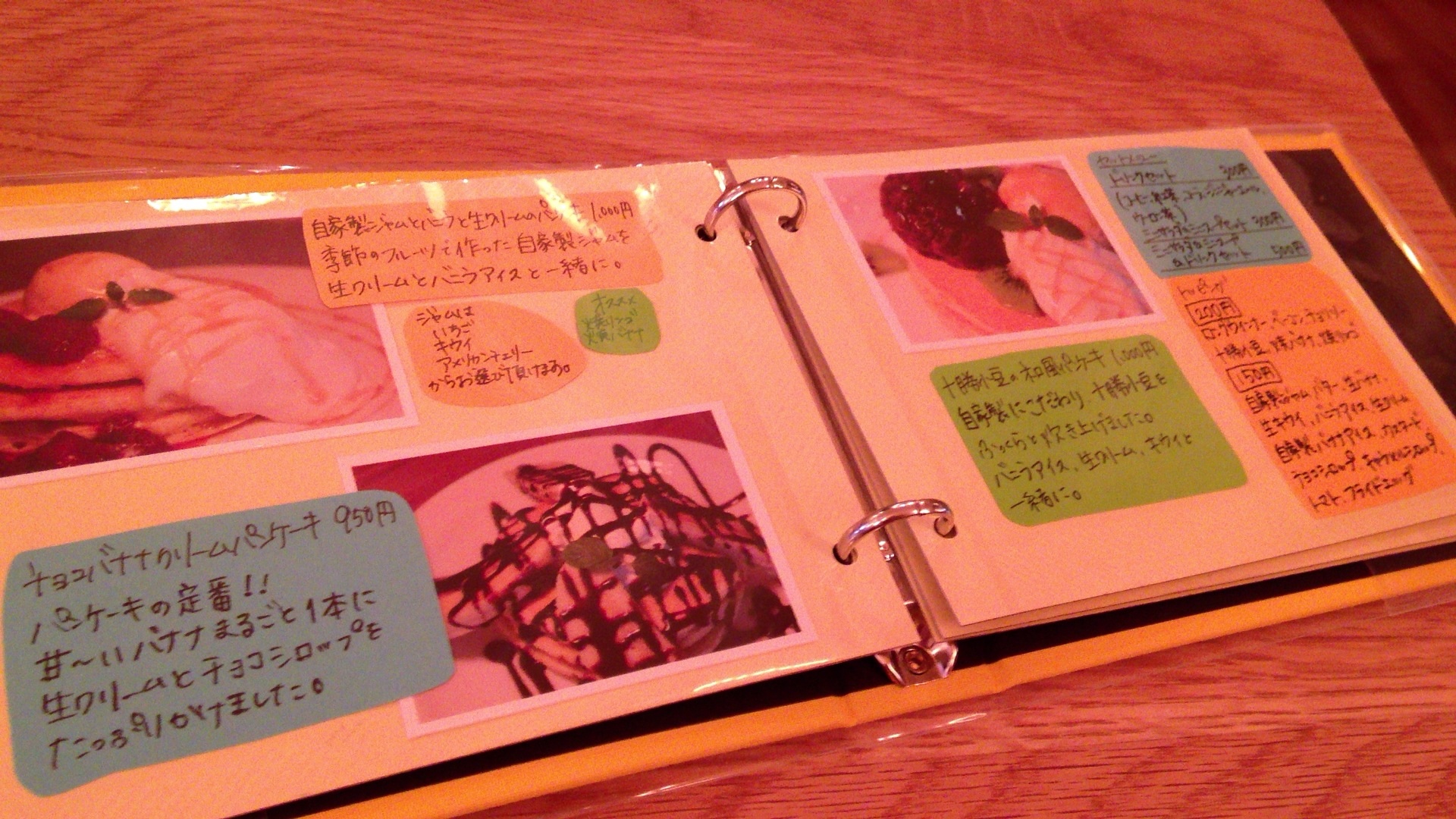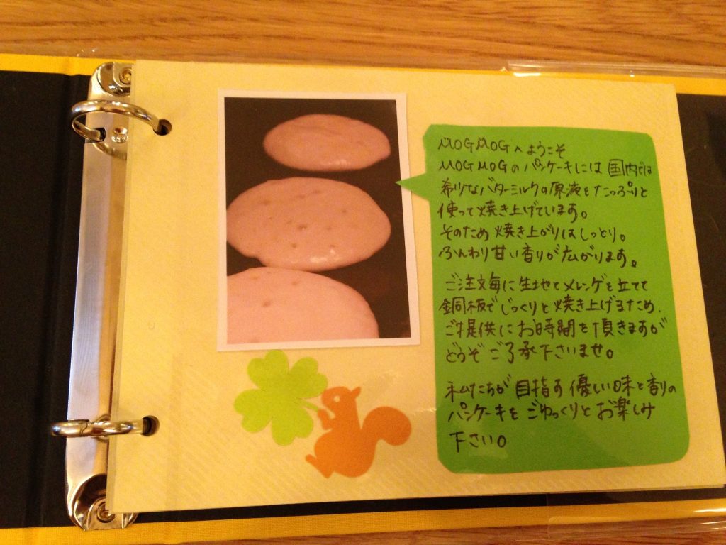 手作りのメニューにはMOGMOGさんのこだわりが書かれています〜 ふむふむ、オーダーが入ってから、生地もメレンゲもたてて焼いてくださるんですね! 今回はバターパンケーキ(850円)にバナナとアイスと生クリームをトッピング。セットでコーヒーをつけました(300円) もちろん元からトッピングののったパンケーキもあります。