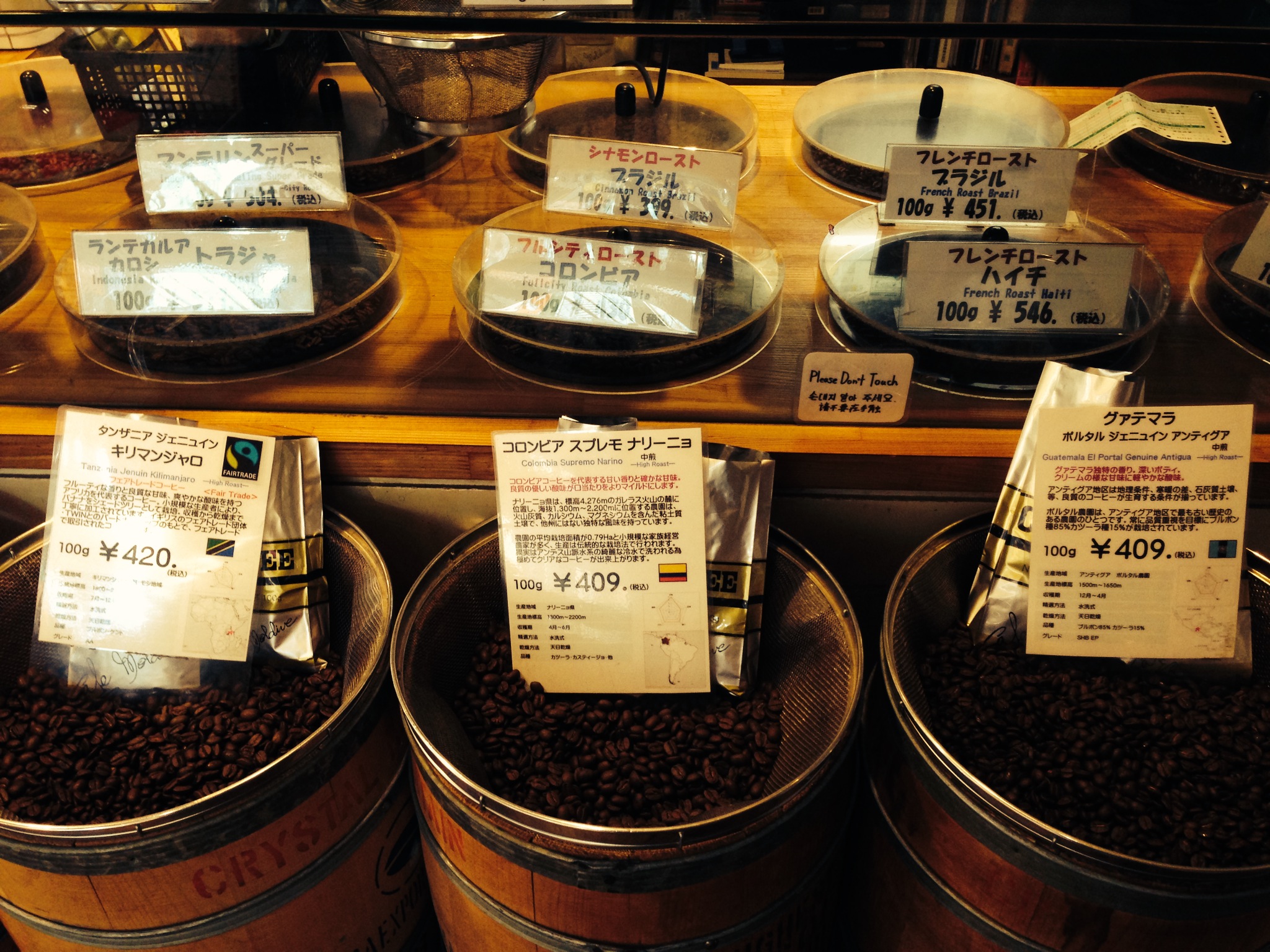 コーヒーにはあまり詳しくないけれど、わくわく!とにかく沢山の種類のコーヒー豆が販売されています。いい香りが伝わらないのが残念。奥では、何か機械が動いています・・