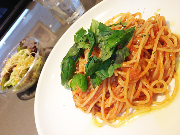 程なくして、パスタランチAの「モッツアレラとバジルのトマトソース」850円が到着。サラダもついてますよー。パスタのゆで具合が絶妙で、本当にお気に入りです。