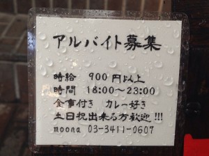 某食べログでいつも高評価を獲得し、下北沢で1番好きなカレー2014でも首位争いをしているお店スパイスキッチン「MOONA(ムーナ)」さんの前を通ってふと目に入ったのはこれ・・