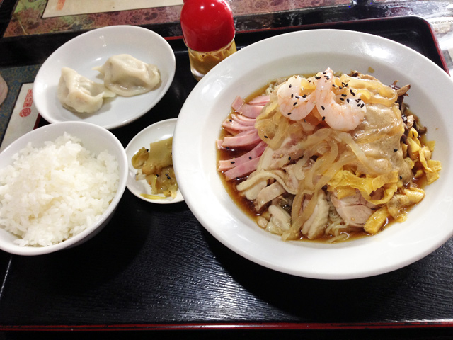 ちょっとこの写真だと盛り加減がわかりにくいですが、具だくさんもりもりの冷やし中華です。ランチセットなので、点心の水餃子、ライス、ザーサイがついてきます。