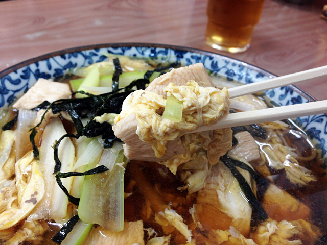 これまでに頼んだことのあるメニューだと、五目になるのかなぁ。鶏肉・ネギ・卵とじ・海苔、とってもシンプルな構成。や、鶏が好きな人はこれがいいんだろうなー。なんとなく、出汁が五目よりさっぱりしてる気がする。