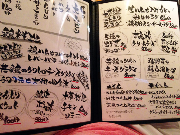 メニューはこんな感じ、最初のページはつくねオンリー!! 、3種類のベースに20種類のトッピングが可能。60種類のつくねが味わえます。あ、月見つくねもあるから61種類ですね(さらにこの日はチーズつくねもあったので62種類)。