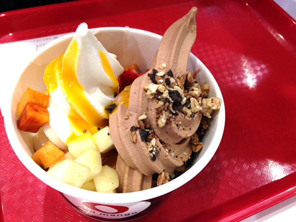 折角なので色々試してみたいと思い、フローズンヨーグルトのベースはプレーン・チョコレート・ストロベリー・マンゴーの4種類。その中から2種類が選べるマンモス(280g・650円) でプレーンとチョコレートをオーダー、トッピングも盛り沢山な5スプーンをチョイス。さらに、ビタミンティー(ホット・480円)も頂きます。