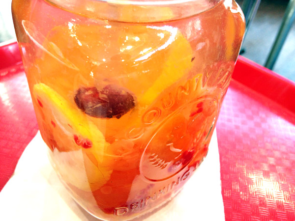 飲みごたえのあるビックサイズのグラスに、シロップ漬けされたたくさんのフルーツが入ってます。マドラーでしっかりとかき混ぜて一口。あー、暖まりますねー。甘すぎず、体に優しい味わいです。ちゃんと混ぜると果肉も一緒にいただけるのでオススメですよー。