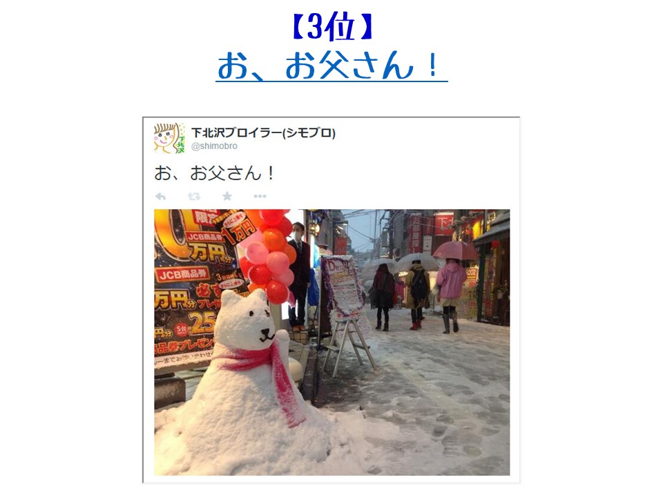 3位が「お、お父さん!」ってのが、何ともツイッターっぽい。この日はすごい雪が降り積もって、いろんなお店が雪だるま作ってたんだよね。下北沢がいつも以上に楽しかった!