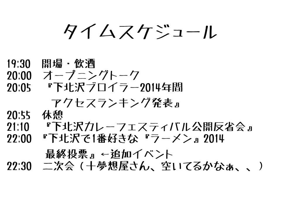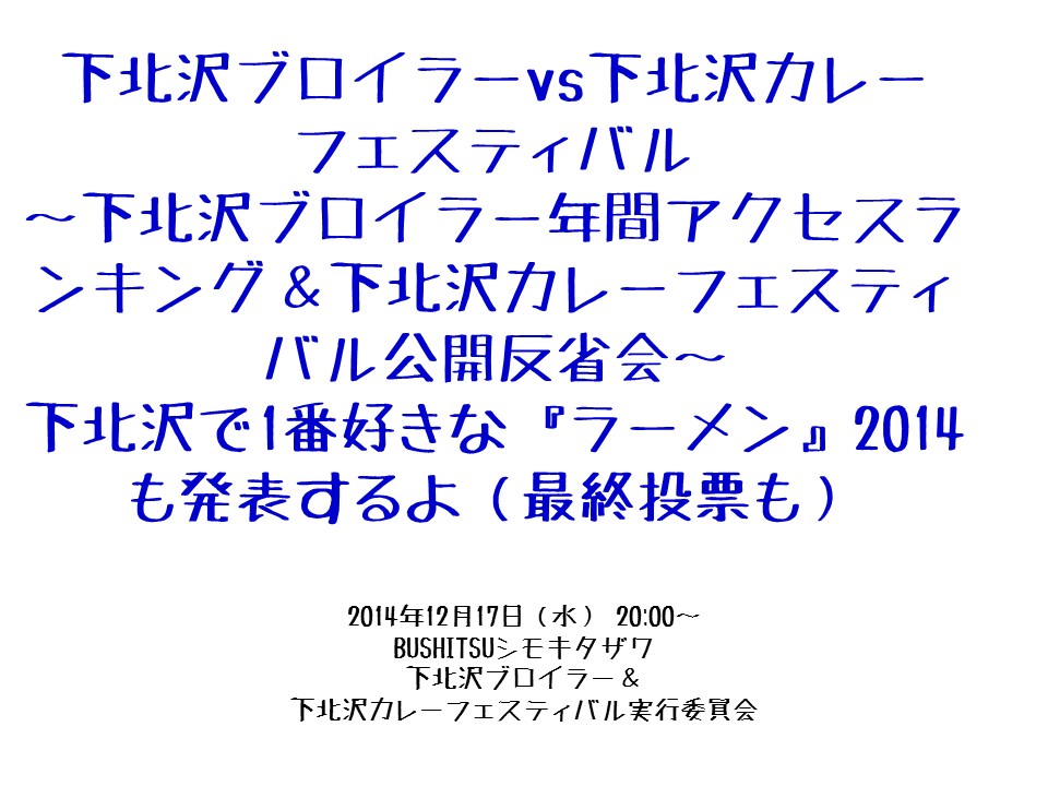 新年ですが、昨年12月17日BUSHITSUシモキタザワにて行われた『下北沢ブロイラー年間アクセスランキング&下北沢カレーフェスティバル公開反省会』のレポートでございます。