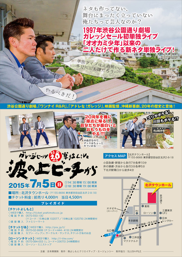 今年で結成20周年を迎えるガレッジセール、7月5日に北沢タウンホールで『ガレッジセール結成20周年単独ライブ ~ 波の上ビーチから始まった~』が開催されます。主にテレビで活躍しているガレッジセールですが、単独ライブは1998年の「オオカミ少年」以来17年ぶりの開催とのこと。コンビ結成20周年に加え、17年ぶりの単独ライブを下北沢で開催するガレッジセールのお2人に、下北沢のことそして今回のライブのことについてお伺いしました。