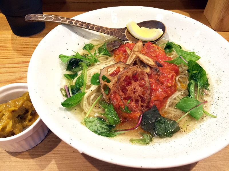 冷やしそばとしての美味しさはもちろんですが、それぞれが合わさった状態の不思議な味わい。決してそれぞれの味が喧嘩するわけではなく、それぞれの良さを感じられるそんなメニューに仕上がっています。あと、ベースのカポナータ、そしてガラムマサラオニオンに辛さがあります。激辛と言うほどではありませんが、程よいピリ辛さ加減ですね。