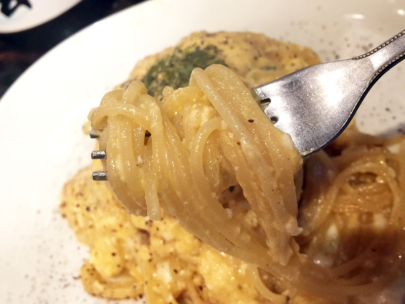 オーダーするとニンニクを炒めるいい香り、「ぺぺ」はペペロンチーノで、「たま」は卵のコトだとは思っていましたが目の前に来たものが予想していない立体物でちょっと驚きました。いやなんだろ、パスタと言うよりはオムレツに近い感覚というか、見たことのないパスタです。ぱっと見、カルボナーラっぽいけど、卵の存在感が全然違います。