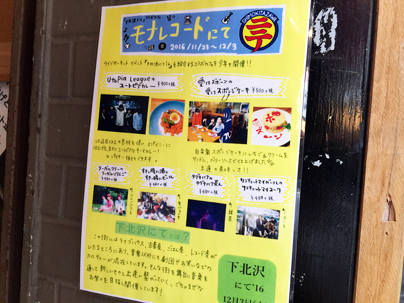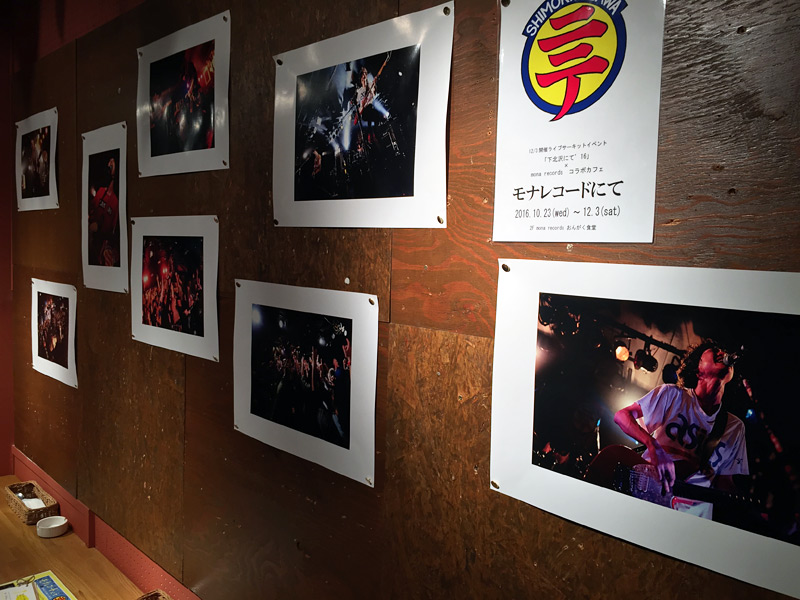 開催当日の12月3日まで、出演アーティストにちなんだオリジナルフード及びドリンクが提供され、出演アーティストの楽曲がBGMとして使われ、さらに店内は昨年開催された『下北沢にて’15』のライブ写真が飾られ、まさに『下北沢にて』一色となっています。