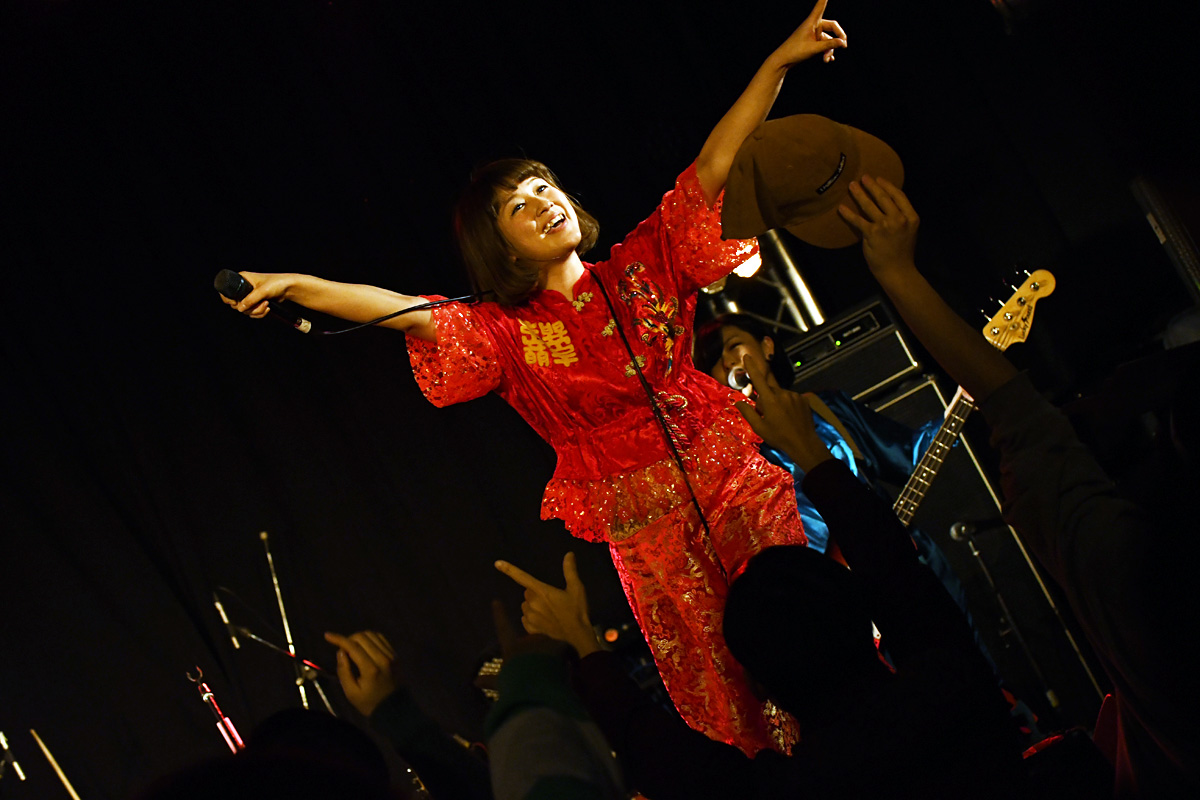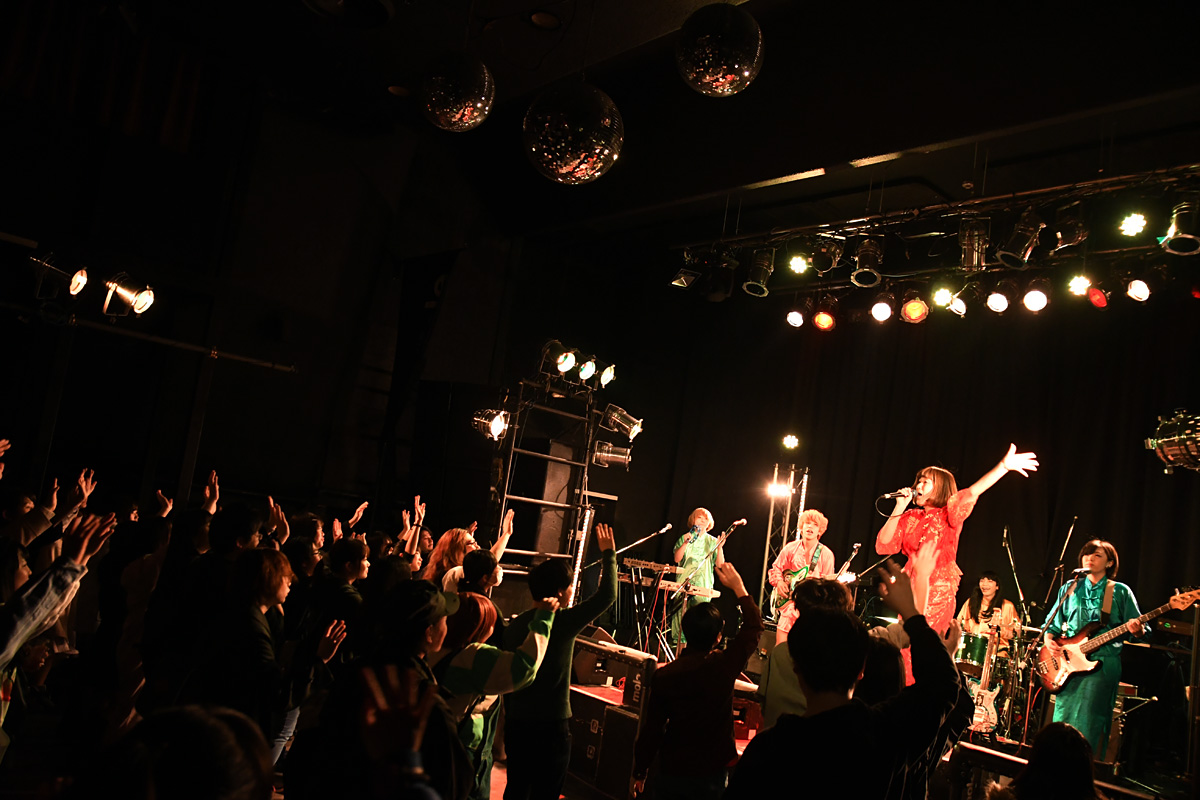 ぽわんの空気がはっきりとハコを満たす中、5曲目に披露されたのは98%J-POPのリードトラックの「しあわせゲットだぜ」。サビでは一斉にフロアの手が上がり、大盛り上がりの中、《ぽわん言えるかな?》レスポンスに突入。忘れ去られていたあししオポチュニティーがステージ前方でギターをかき鳴らすと、盛り上がりは最高潮に! そのままの勢いで、ラストの「ハッピーミラクルラブソング」へ続きます。