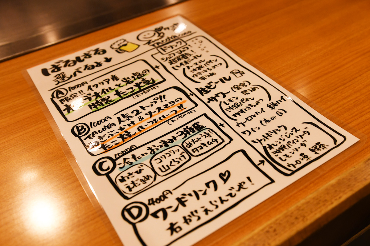 TACOYAcocoはMAPにも掲載されている「限定!!イタリア産オリーブオイルと岩塩の特製たこ焼き」と「ねぎぶっかけ&ソースマヨのたこ焼きハーフ&ハーフ!!」の2種類のたこ焼きメニューと、わさびえだまめ・コリコリッ山クラゲ・めちゃうまいタコキムチが楽しめる「冷たいおつまみ3種盛り」の3種類のメニューから選べます。折角なので、たこ焼きを一つずつ注文。