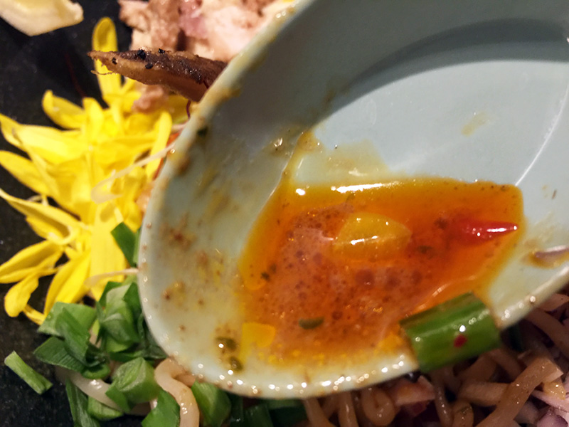まぜそばなのでタレ(スープ)自体は少なく、食べる前に麺に行き渡るようにしっかりと混ぜ合わせます。湯気と共にスパイシーな香りが拡がります。