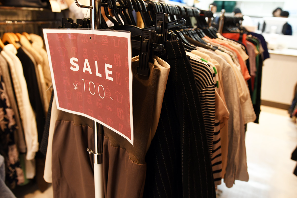 1階にはメンズ・ウィメンズそれぞれの注目アイテムが並びます。セール商品については100円からと超お得!