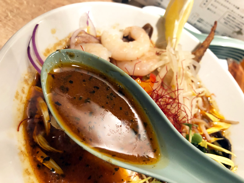 「点と線.」の特別メニューは『スパイストムヤムラーメン』1200円(税込)。このお店のことをご存じない方に説明すると、「点と線.」は一番街商店街の路地裏にある行列ができているカレー店「Rojiura Curry SAMURAI.」が手がけるスパイスラーメンのお店。スパイスラーメンというとイメージが湧かないかも知れませんが、ラーメン版スープカレーです。スープカレーラーメンではなく、スパイスラーメンというネーミングがとっても似合ってます。しもブロでも何回かご紹介しています。