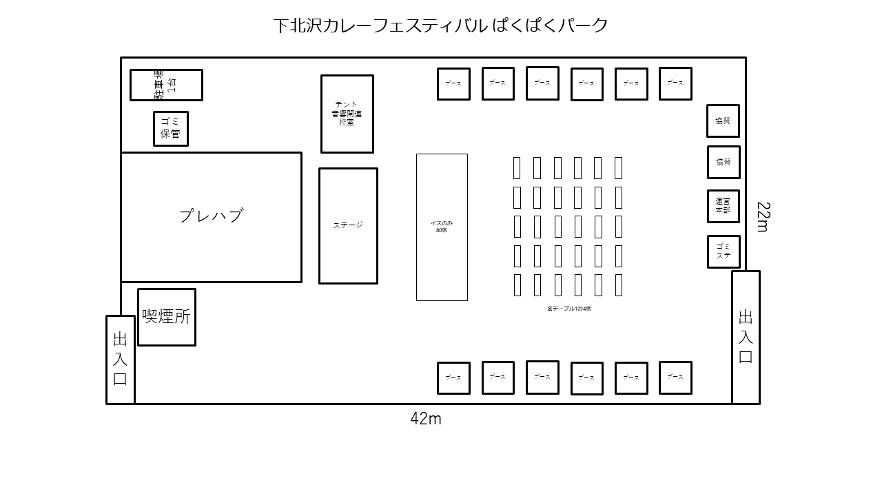 まず、『ぱくぱくパーク』の概要について、簡単に説明すると「下北沢カレーフェスティバル」用のフードコートです。これまでもカレーフェスティバル参加店ではカレーのテイクアウトが可能でしたが、テイクアウトをしてもそれらを食べる場所が下北沢の街にはありませんでした。また、イベント自体年々盛り上がりが増し、休日はどのお店も混雑し至る所に行列ができていました。