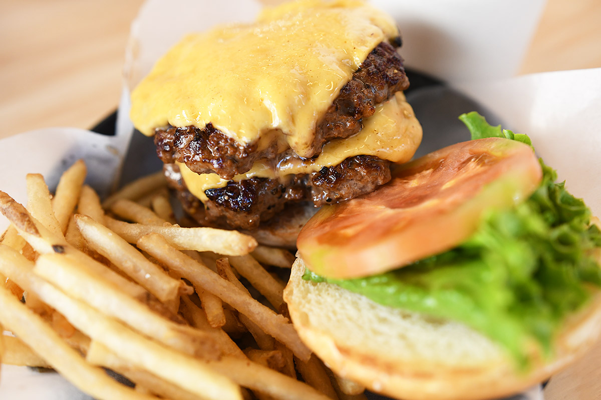 スタッフの方から肉感を味わうのならダブルパティをオススメと言われたので、チーズバーガーコンボのダブルパティをオーダー。開店から全く列が途切れなかったのでちょっと時間がかかるのかなと思いましたが、10分ほどでベルがバイブしカウンターへ。ちなみに、ドリンクはレジでの注文時に渡されます。