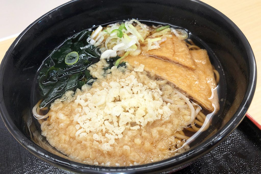 箱根そばの「朝そば」は、おそばに、味の染みた油揚げ、わかめ、天かす、ねぎがのっています。かき揚げや天そばほどボリューミーではなく、それであってある程度の満足感のあるメニューです。トッピングとしてミニかき揚げや、一膳ご飯をつけるのもありですね。