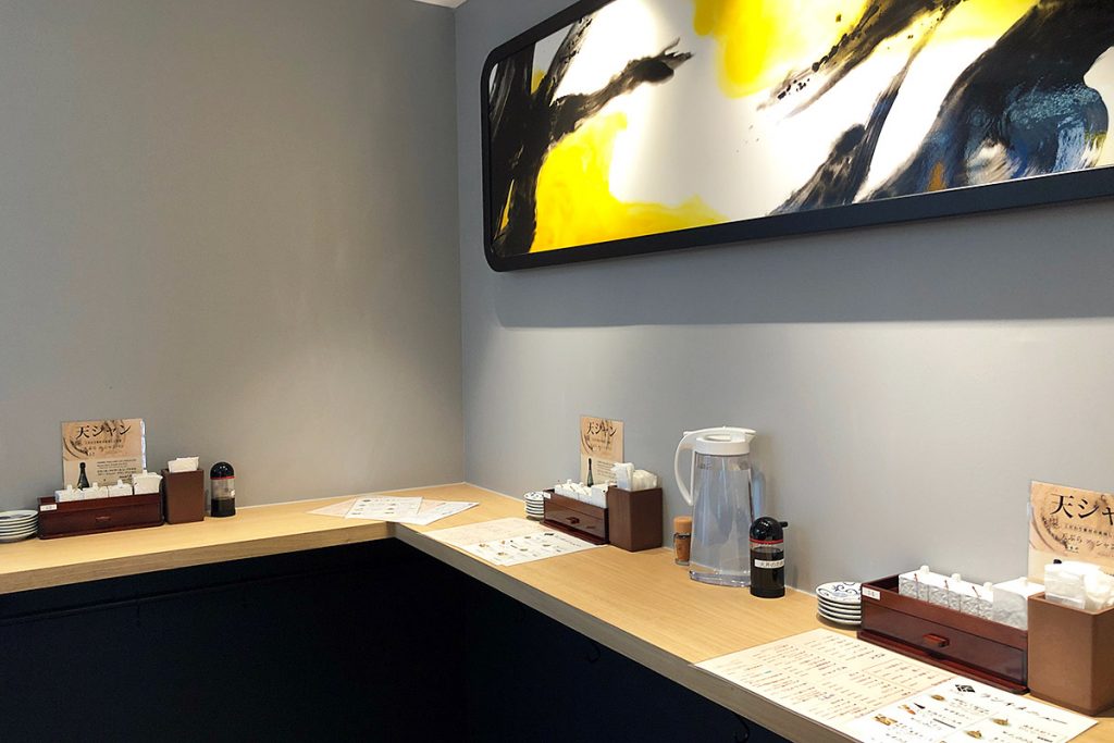 卓上には醤油と七味に加え、カレー塩・抹茶塩・ヒマラヤ岩塩の3種類の塩。好みの味で天ぷらを味わうことができます。