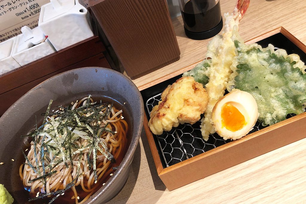 ランチメニューは天丼と冷やし蕎麦セットの5種類。天丼も気になりますが、まずは天ぷらを味わいたかったので「天ぷら 冷やし蕎麦セット」をオーダーしました。蕎麦はうどんに変更可能です。