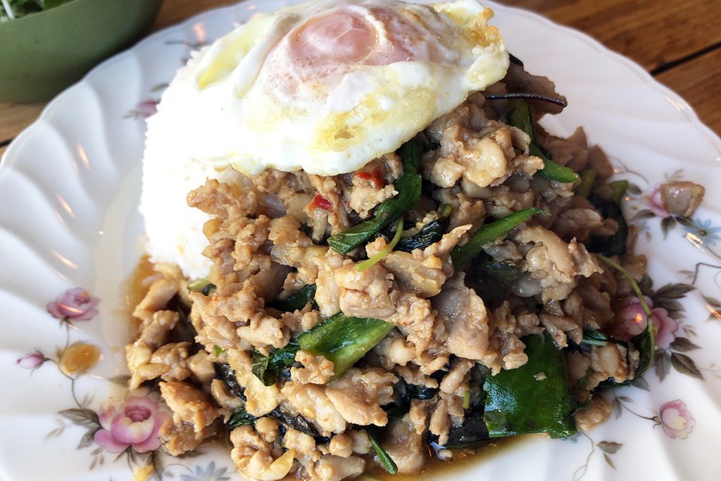 スープの美味しさに感動する中、ガパオ・ガイがテーブルに。写真だとよくわからないとおもいますが、結構ボリューミーです。