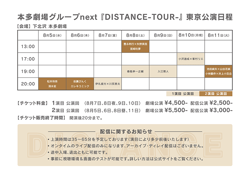 劇場、お客様、そして演者、スタッフの間に生まれてしまった距離を、少しずつ縮めていくべく立ち上がった今企画、「DISTANCE」。この度の第二弾では、全国公立文化施設協会の新型コロナウイルス感染拡大予防ガイドラインを基に、全キャスト&スタッフへのPCR検査実施、本多劇場には抗菌コーティング処理を施し、客席は前後左右を一席ずつ空けてご案内するなど、新型コロナウィルス感染拡大予防対策を一層強化し、ご来場者の皆さま及び出演者・公演関係者の安全と安心を確保することに努めた上で、お客様をご案内しての「劇場公演」と、「配信公演」の両形態を全公演でおこなう。