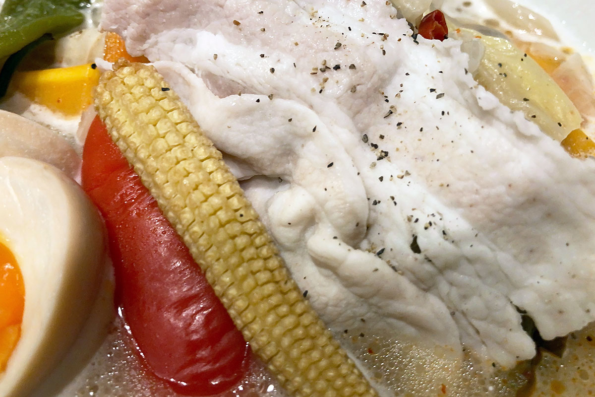 タンメンにはおなじみの野菜をはじめとして、夏野菜がたくさん。パプリカのハッキリとした甘みに、ヤングコーンのほのかな甘み、万願寺唐辛子のクセのある美味しさとちょっぴり辛いシシトウ、そして、このラーメンのピリ辛の源泉にもなっているニラの豆板醤炒め。それぞれの野菜が個性を主張していて、全ての味がスープに含まれ類と考えると複雑な味わいも納得できます。