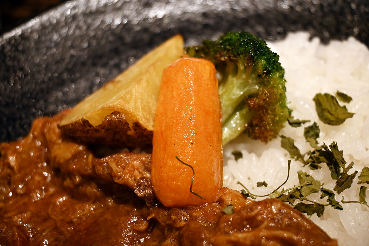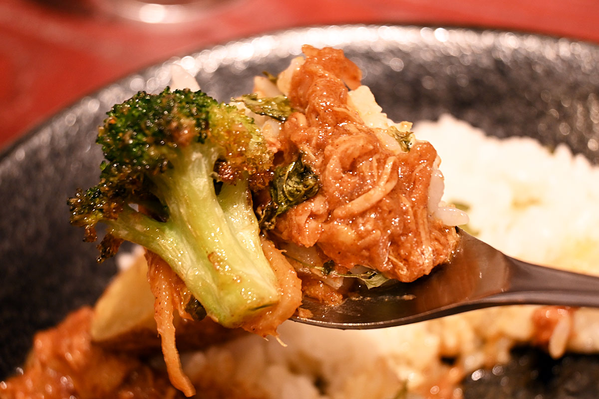元々最もスパイスを感じられるカレーですが、激辛にしたので結構辛い。そのせいか、付け合わせのお野菜の甘みがしっかりと感じられました。ハーフサイズですが満足感のあるカレーを頂くことができます。独特な爽やかな後味がとても印象的なカレーです。
