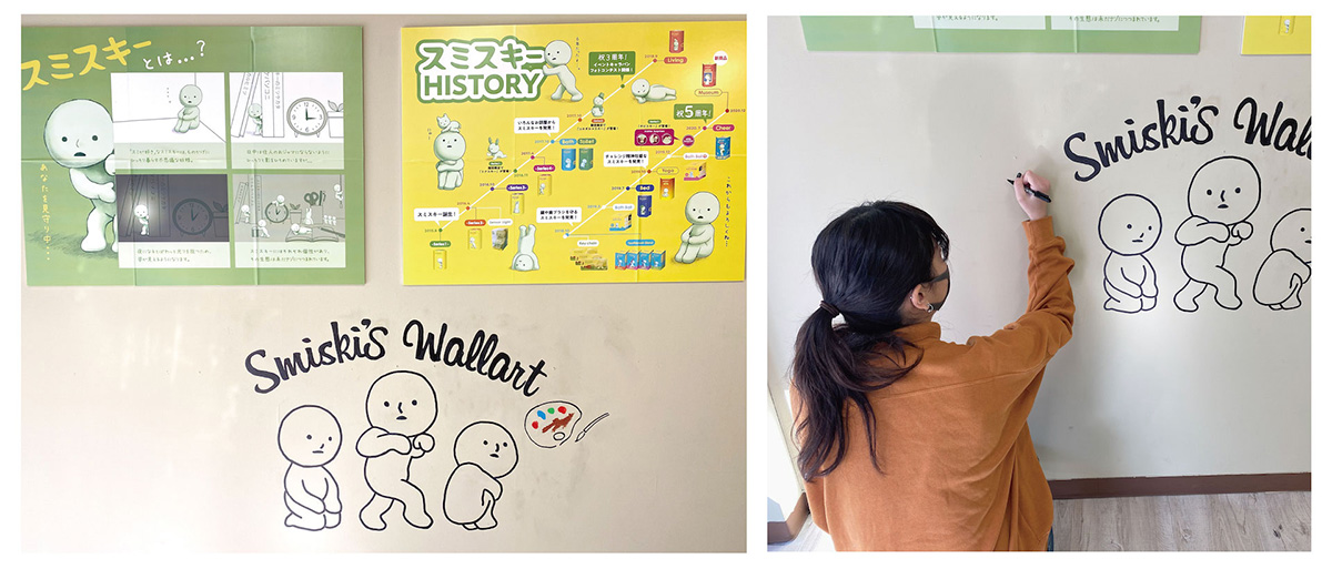 来場者のみなさまと一緒につくるウォールアート。入り口左側のパネルの下スペースにあなただけのスミスキーのイラストやメッセージを描いてください。2ヶ月後にはどんな作品が完成するのか、お楽しみに!