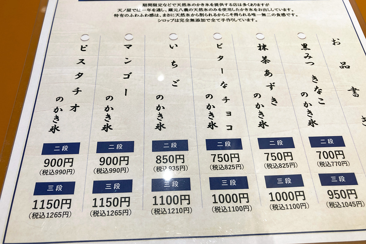 天然氷のかき氷専門店ということもあり、メニューはかき氷オンリー。「いちご」や「マンゴー」といった定番かき氷に、「黒みつきなこ」や「抹茶あずき」など和テイストのかき氷から、「ビターなチョコ」「ピスタチオ」のようなスイーツ感満載のかき氷まで、様々な種類のかき氷がメニューに並びます。ちなみに、二段と三段の違いはシロップをかける回数の違いですが、かき氷自体のサイズも大きくなります。