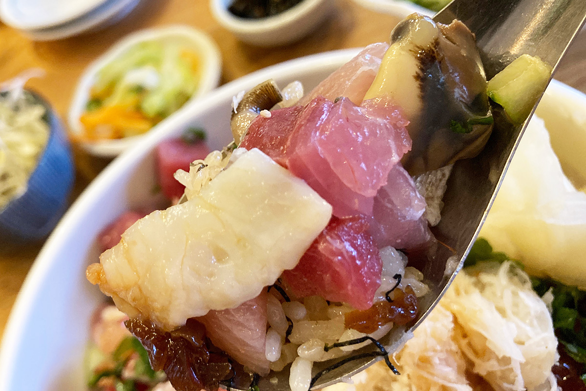 「ばらちらし」もスペシャルランチと同じくすごい。ごはんが全く見えないほどに盛られたたっぷりの魚介、もはや最初はごはん抜きで具のみを味わえるレベルです。どのくらいの具材が入っているのか見当もつきませんが、どう考えても10種類は超えていますね。