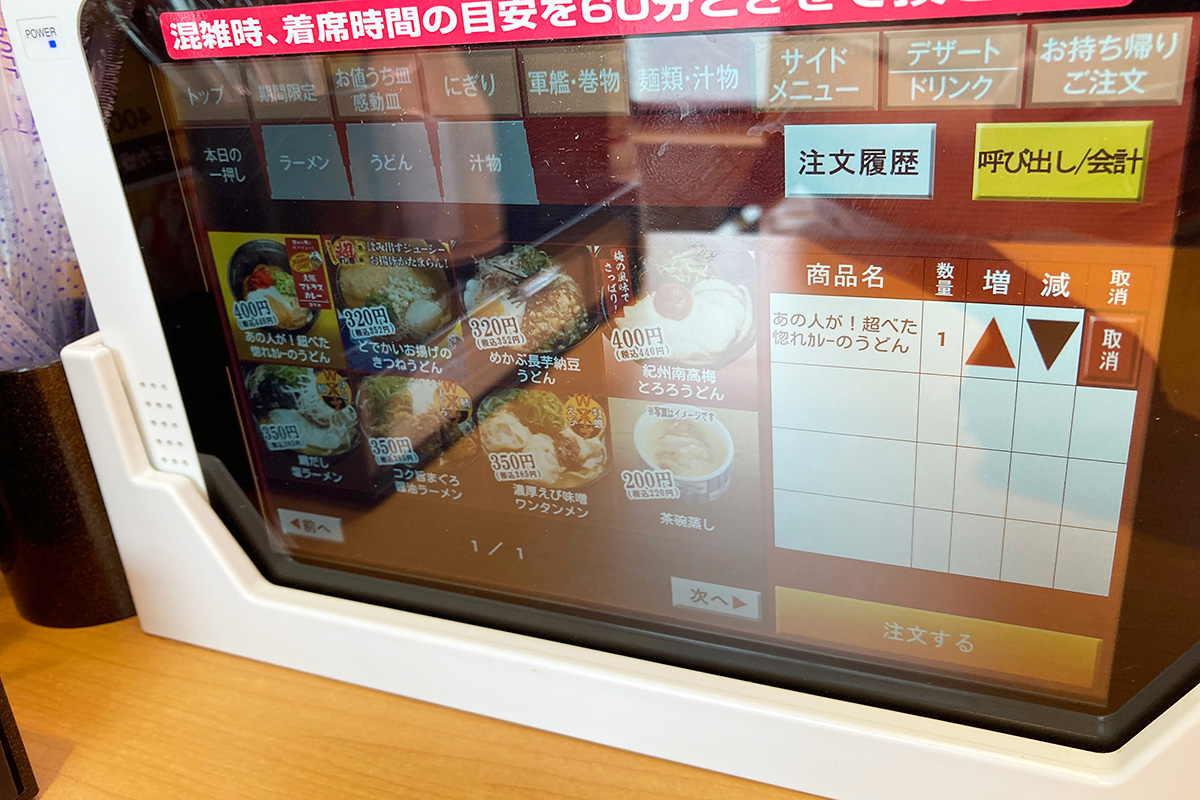 開店直後の11時過ぎにお店に行ったわけですが、お客さんは2人だけ。まあ、ちょっとランチには早すぎるしなぁ。カウンターじゃなくてテーブル席に座ればよかった。店員さんに「超てんこ盛り!海鮮爆盛りマウンテン」を推されるけど、そんなのいらない俺はカレーうどんを食べに来たんじゃ! なんというか、予想以上にコラボメニューのカレーうどんを推しててびっくり。で、カレーうどんが回ってくるはずはないので、タッチパネルで注文ですよ。絶対厨房の人、なんでいきなりカレーうどんやねん!って思っただろうなぁ。で、カレーうどんだからなかなか来ない。なんだろ、うどんちゃんと茹でてるのかな、カレーは温めるだけだろうけど、、、なんか、時間かかりそうだから、お寿司も食べることにした。