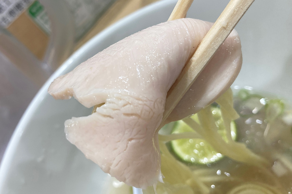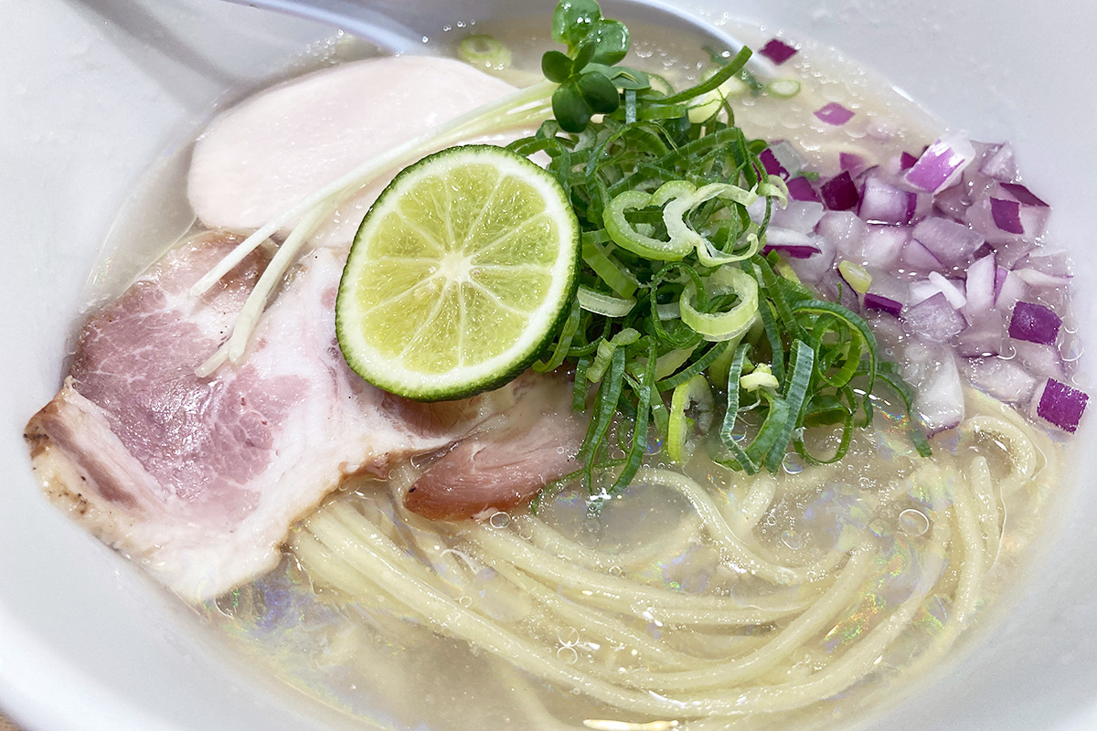 冷やし麺なので香りはそこまでではありませんが、スープを一口飲むと貝の旨味がダイレクトに伝わってきます。ラーメンのスープと表現するより、貝をふんだんに使った冷製スープと呼ぶべき味わい。そして、冷水でキリッとしめた麺がものすごいコシでスープにとても合います。