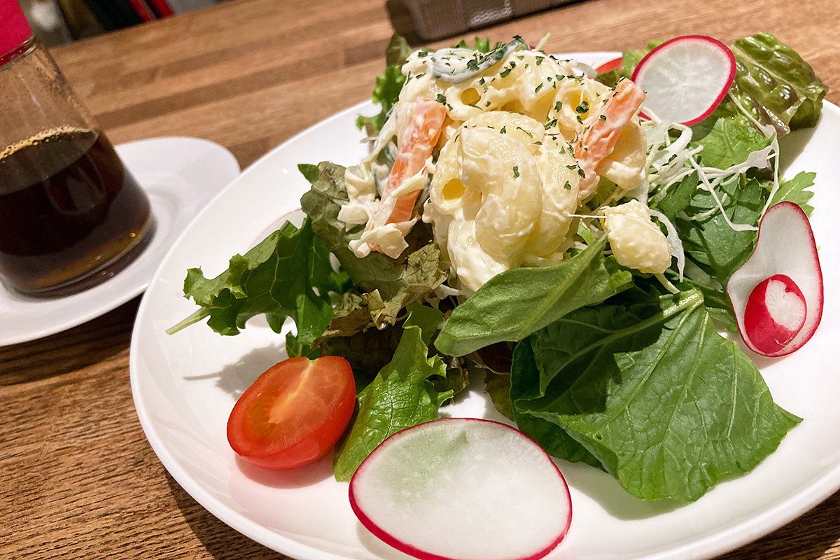 まず出てきたのは、色とりどりなお野菜を使ったサラダ。公式サイトに掲載されていたサラダはフツーの感じでしたが、実際に出てきたのはガチの洋食屋さんのサラダで雰囲気が全く違う、もうこれだけで期待感がマックスに!
