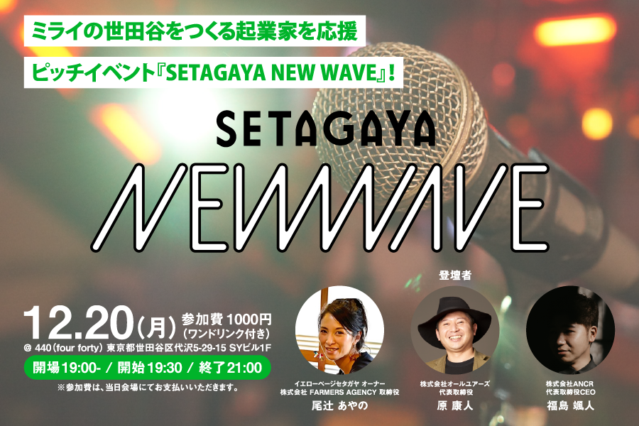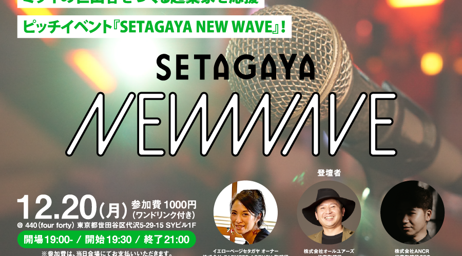2021年12月20日(月)下北沢のライブハウス「440」にて、アイデアを持つ登壇者とそのアイデアを共にカタチにしていく応援者のマッチングを創出するピッチイベント『SETAGAYA NEW WAVE』が開催されます。
