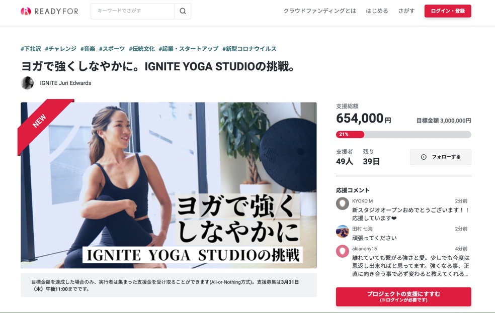 このチャレンジを達成するには、私たちの力だけでは叶いません。IGNITE YOGAを既に体感して頂いている方、IGNITE YOGAを知らなくとも、大切な人、不安な毎日を過ごす誰かの力になりたい、そんな私たちのミッションに共感 いただける方、お力をお貸してください。IGNITE YOGAがその想いを体現し、私たち自身が強くなる「術(すべ)」を、ここ下北沢から発信し続けるため、ご支援をお待ちしております。