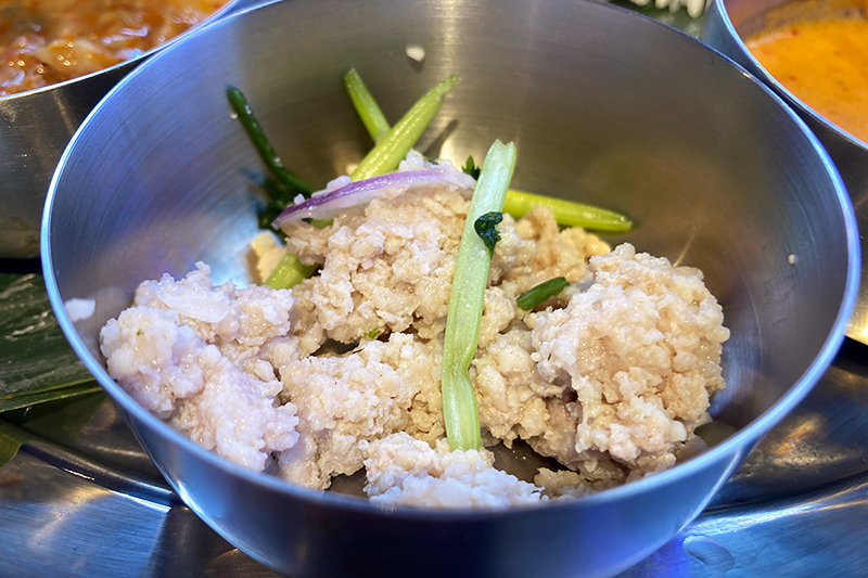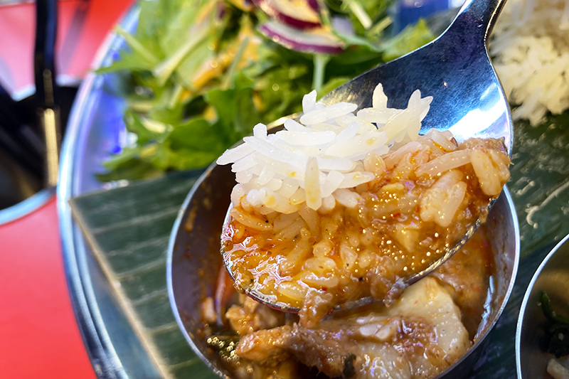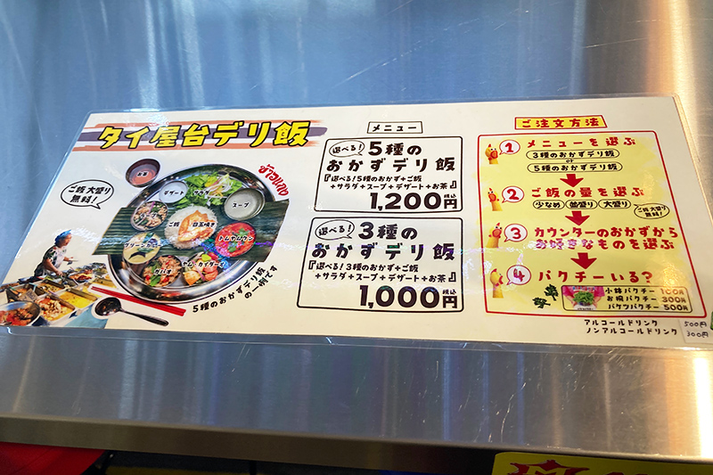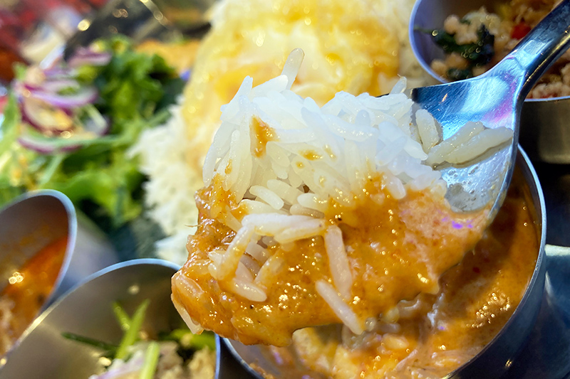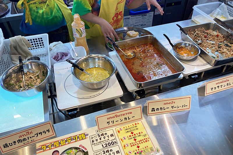 ランチタイムは「タイ屋台デリ飯」として屋台っぽい雰囲気で並ぶタイ料理の中から3種(1000円・税込)または5種(1200円・税込)を選び、プレートに載せて頂くスタイル。この日並んでいたのは、「鶏ひき肉のハーブサラダ」「グリーンカレー」「森のカレー ゲーン・バー」「マッサマンカレー」「ガパオ」「タイラーメン」「トムヤムラーメン」でしたが、実はランチタイムの終了間際に来たので売り切れた料理もあったみたい。はい、早めにいきましょうー。