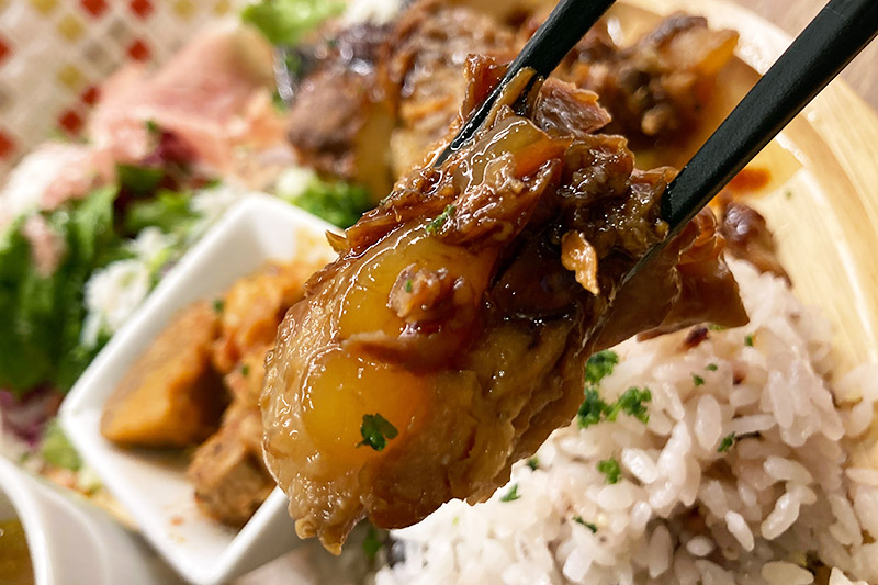 とーってもボリューミーなランチプレートは、とろっとろに煮込まれたお肉やキッシュ、生ハムと共に彩り豊かなお野菜、ラタトゥーユ、スープに雑穀ご飯と、様々な料理が一度に楽しめます。どれも美味しいのですが、特にお肉が絶品! とろっとろに煮込まれぷるぷるな軟骨部分も含め、びっくりするくらい美味しい料理が味わえます。お野菜がたくさんなのも嬉しいですね。