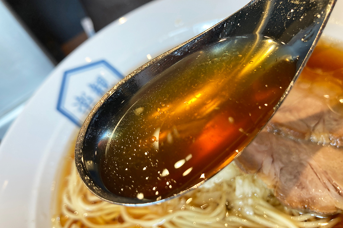 まずはスープを一口、なんというか透明感のある上品な味わいでありながら、旨味がしっかりと感じられます。中細ストレート麺との相性も抜群、お店のスタイリッシュな雰囲気にマッチする、美しい味わいのラーメンです。