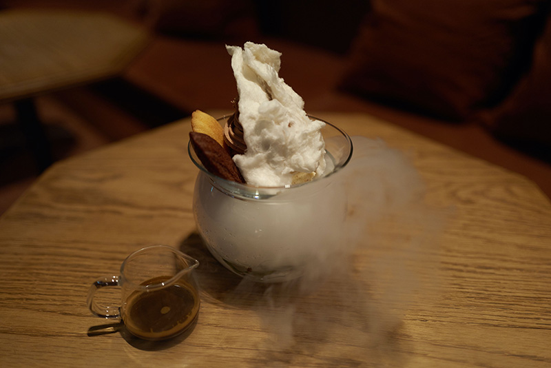 猿田彦珈琲のアイスクリームブランド「Tiki Taka ICE CREAM」とエスプレッソを使用したアフォガードをベースにした特製パフェ。ピスタチオアイスにムースショコラ、2種類のミニマドレーヌをn載せ、仕上げには綿菓子トッピングしました。熱々のエスプレッソを注ぐと綿菓子が溶け出し、エスプレッソソースに生まれ変わります。もくもくと立ち上がるドライアイスが冬らしさも演出します。