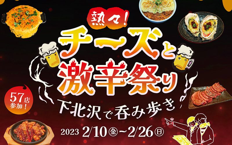 2023年2月10日(金)から26日(日)までの17日間にわたり、下北沢の飲食店57店舗が参加する呑み歩きイベント『熱々!チーズと激辛祭り 下北沢で呑み歩き』が開催されます。今回で14回目、これまでに15万人以上が参加した、下北沢の街バルイベントです。