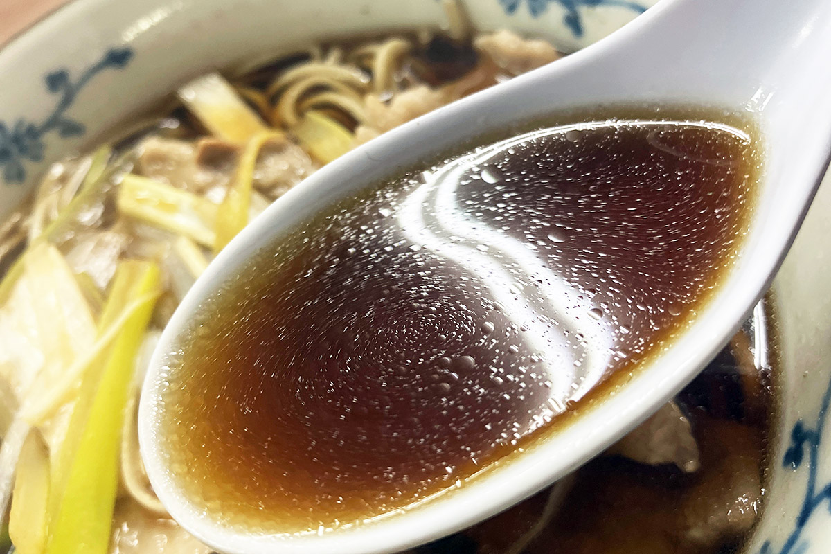 ネギというと「鴨南ばん」が真っ先に思い浮かびますが、豚肉を使った「肉南ばん」も相性抜群。豚バラ肉の脂がつゆに合わさり独特のうま味が感じられます。おそばにはさっと火の通ったネギが入りこちらもネギ特有の甘みが感じられますが、刻みネギを入れればシャープな味わいで頂くこともできます。卓上の七味を振りかければ、刺激的な味わいと共に体がしっかりと温まります。