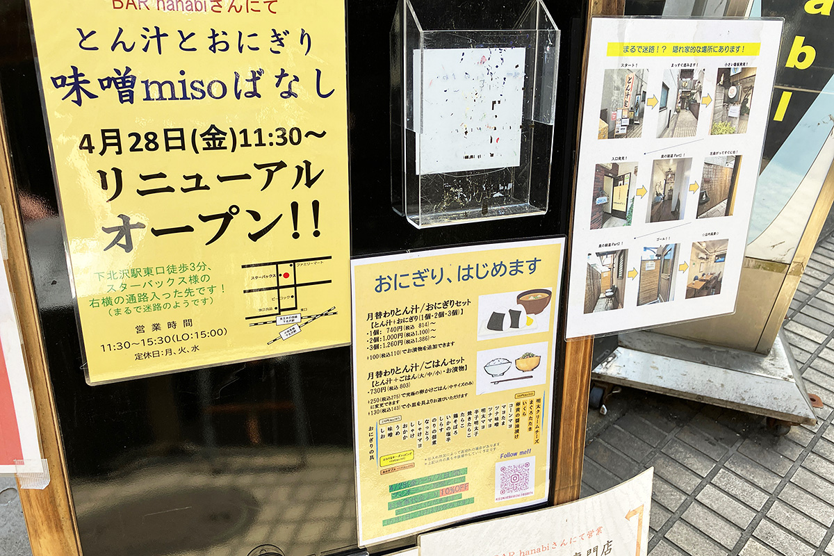 2023年4月28日(金)、BAR hanabiで間借り営業をしている『味噌misoばなし』がリニューアル、とん汁は月替わりになり新たにおにぎりのセットメニューが加わったと知り、早速味わってきましたー。