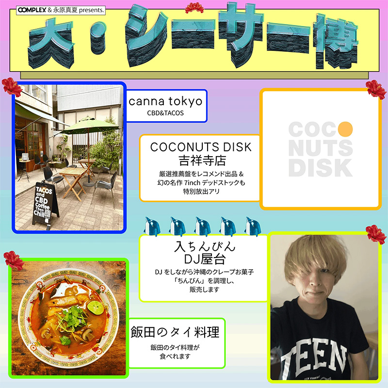 下北沢にお店がある「canna tokyo」からは、今回のイベント出店に合わせ限定で「沖縄タコス」を。「COCONUTS DISK 吉祥寺店」からはCOMPLEX & 永原真夏さんによって90s~Y2K 吉祥寺周辺(広義)の青春の音楽を想い、厳選推薦盤をレコメンド出品。「入ちんびんDJ屋台」では沖縄の伝統的で定番おやつ「ちんびん」を、「飯田のタイ料理」ではベーシストの飯田さんによるタイの定番メニューにトロピカル感を加えたこの日限定メニューがそれぞれ味わえます。