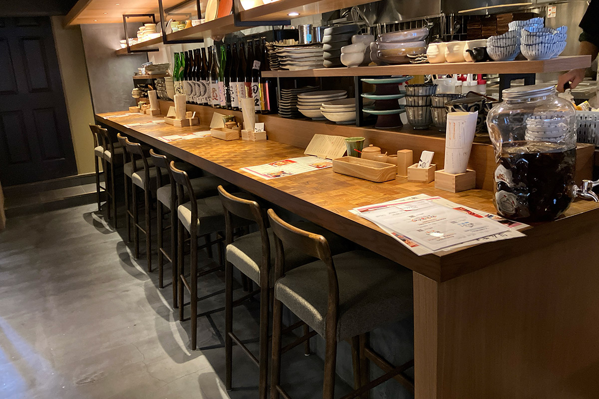 店内はカウンター席や2人テーブル席と4人テーブル席などあわせて34席。お店の広さ的には席数が少ないのでゆったり、ウッディーでとても居心地のよい雰囲気です。