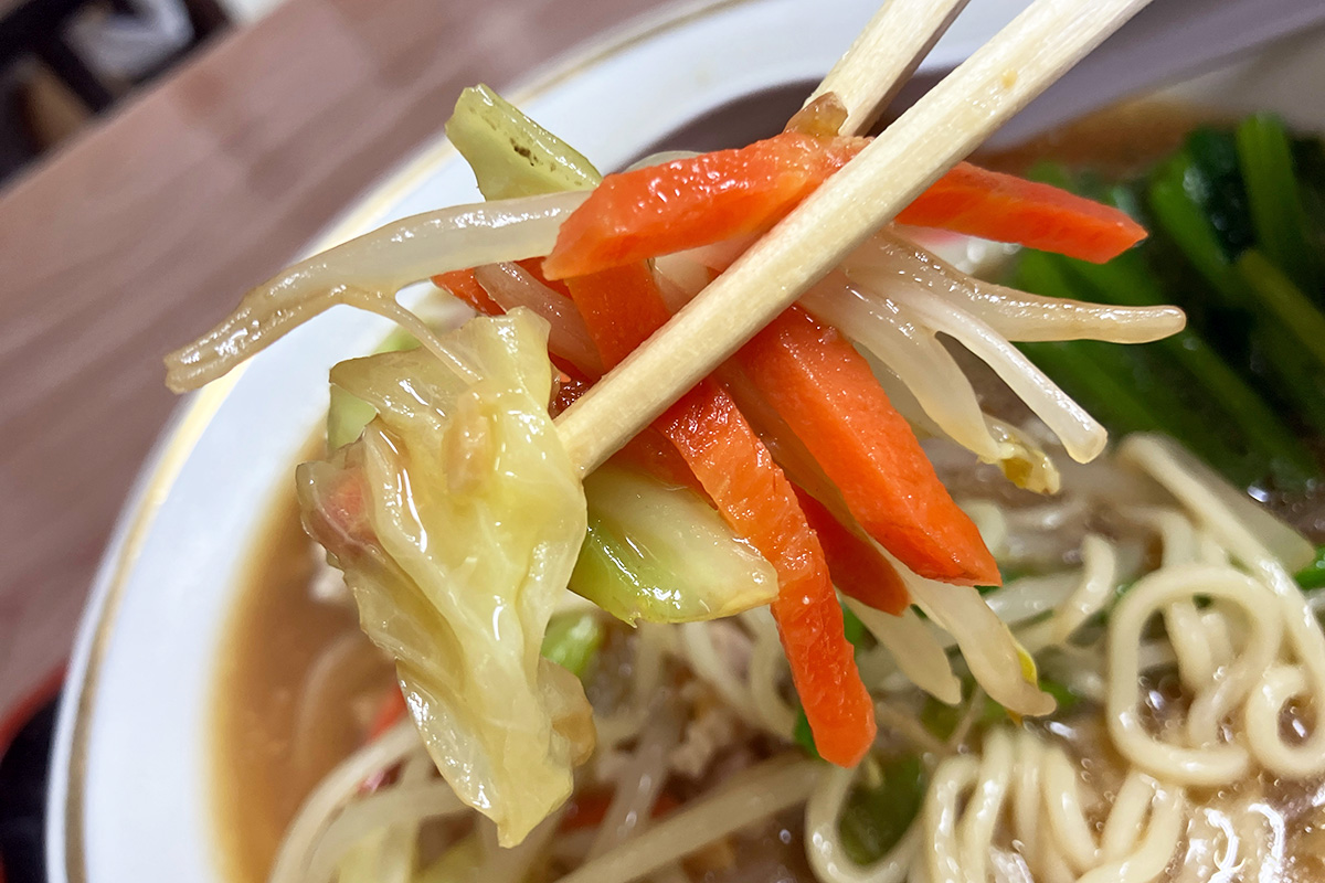 さらに、この野菜がめっちゃ甘い! なんだろう、人参が甘いのかな? 甘って声に出るくらい甘い、でも不自然な甘みではなく野菜本来の味わいです。あー、あと豚肉の脂の甘みもありますね、麺とよく合います。