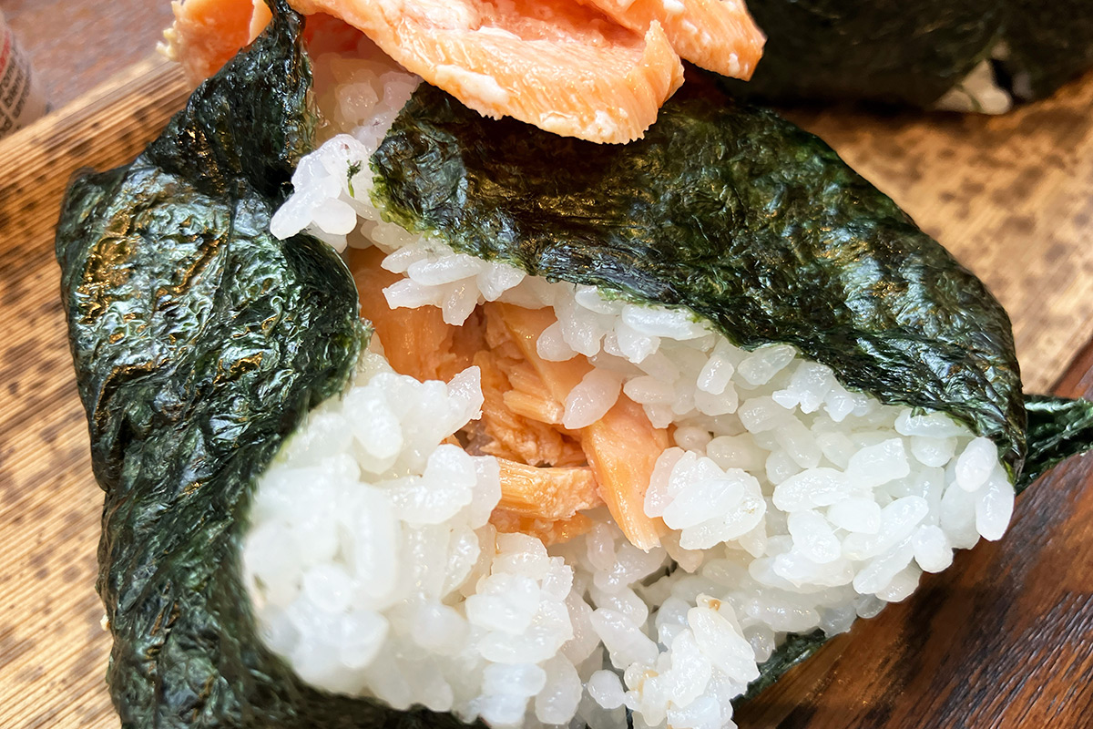 まずは「銀鮭おにぎり」から、というかですねトッピング倍盛りにしたらめっちゃ凄いのが来ちゃったのですが、、、。とりあえず銀鮭のみで1つ味わってみると、銀鮭の旨みとしっかりと聞いた塩味。ああ、お米と一緒に食べるべきだ。おにぎりの中にも銀鮭たっぷりで、思う存分堪能できる一品です。