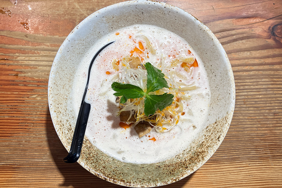 そして、懸案のスープですが、エスプーマ状のスープはとてもクリーミーで、実はたっぷり入っている辣油の辛さとのコントラストが新鮮です。いわゆるゴマのクリーミーさとはちょっと違いますね。端的に言ってめちゃめちゃ美味しいです。